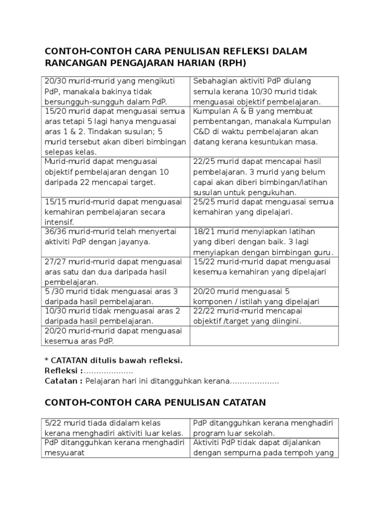 Pengajaran dan pembelajaran pada hari ini sangat memuaskan. Contoh Penulisan Refleksi selepas tamat sesi PP Pengajaran dan Pembelajaran dalam Buku Rekod Pengajaran Harian RPH. Fakta yang menjelaskan bahawa penyelidikan tindakan ialah mengenai penyelidikan tentang amalan diri sendiri McLean 1995 menjadikan refleksi sebagai bahagian yang penting dalam penyelidikan tindakan.